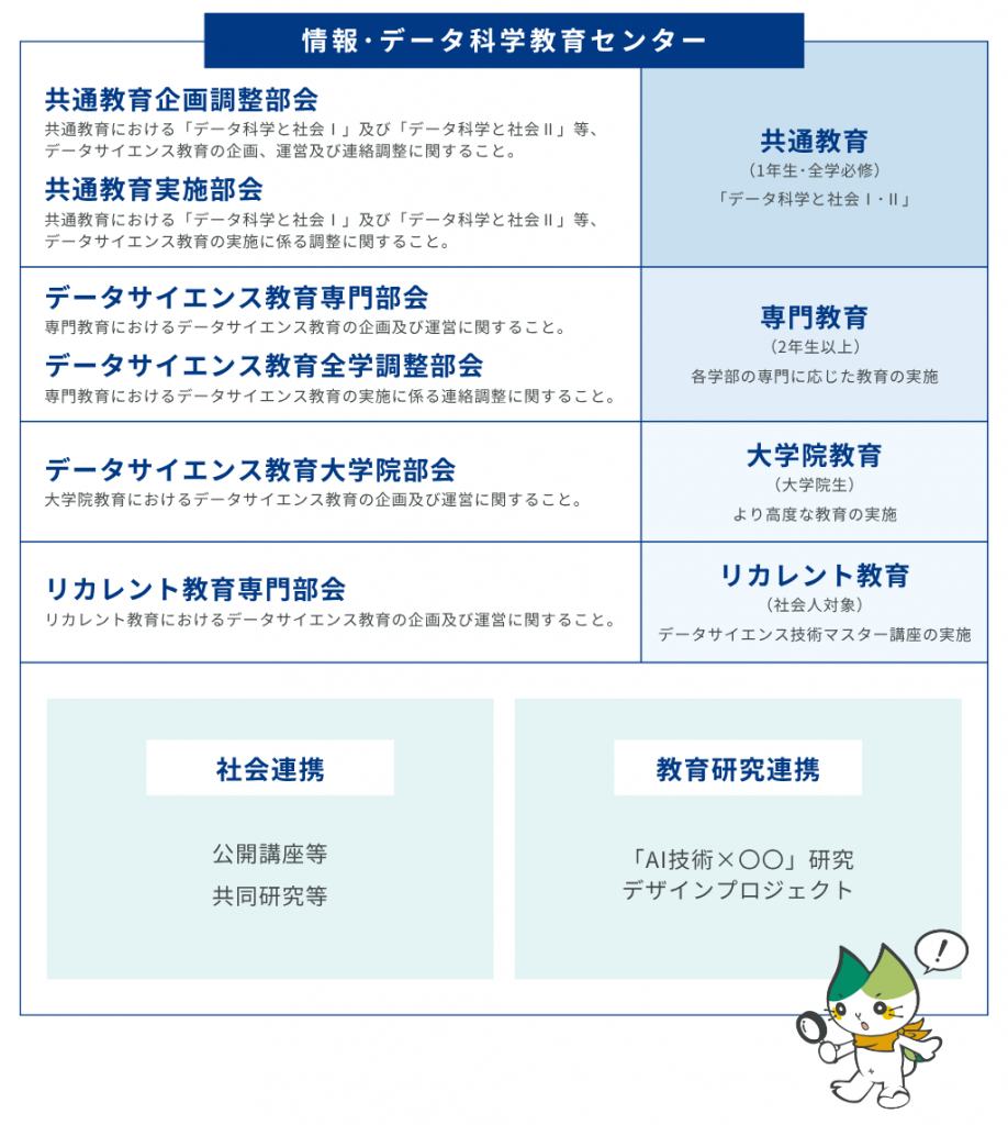 情報・データ科学教育センターが各学部と連携し本教育プログラムの計画・実施・評価・改善を担っている。